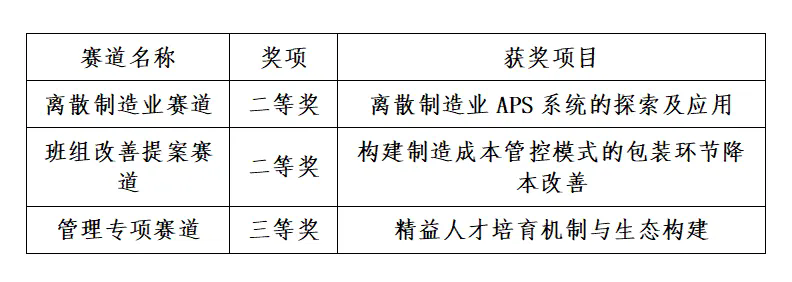 最终,我集团申报的离散制造业赛道项目《离散制造行业APS系统的探索及应用》、班组改善提案赛道项目《构建制造成本管控模式的包装环节降本改善》双双拿下大赛二等奖,管理专项赛道项目《精益人才培育机制与生态构建》荣获三等奖,可谓成果丰硕。