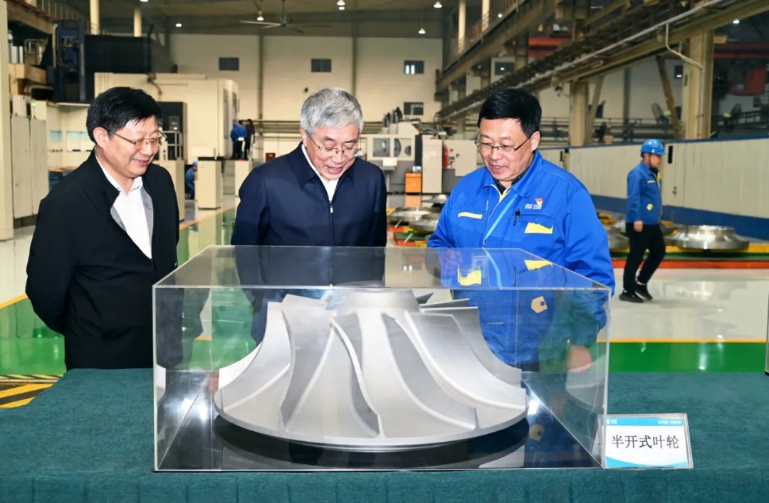 在戴继双的陪同下,王凌宇一行先后参观了沈鼓集团展览展示中心、转子车间、定子车间、总装车间和核电公司,详细了解沈鼓集团的发展历程、科技创新体系、重大装备国产化等情况。