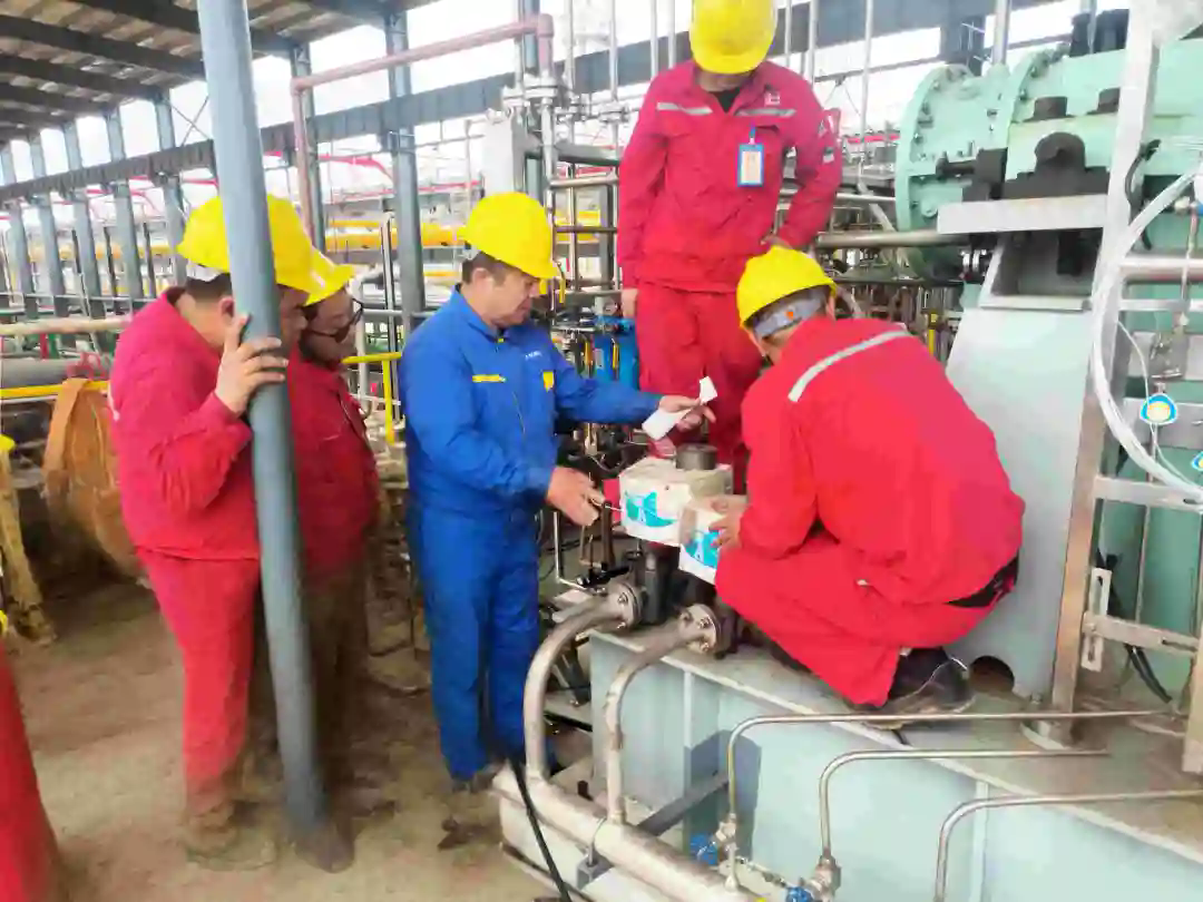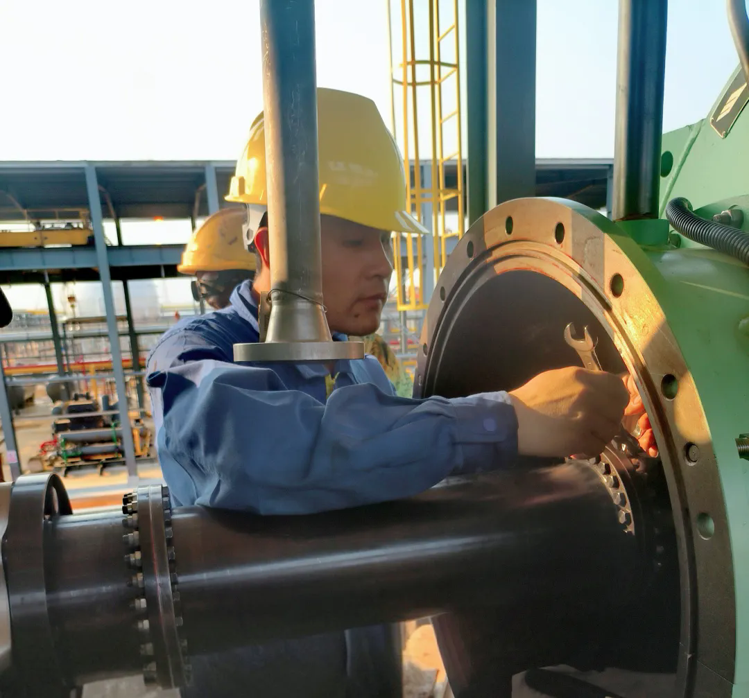 项目启动初期,由于当地的技术、施工人员经验不足,面对精密压缩机的安装调试犯了难,复杂的工艺要求、微米级的校准要求,远超他们的实操经验。陶卉、李海涛接到求助后,秉承着沈鼓集团“成就客户”的企业核心价值观,主动把“合同外”当成“分内事”,凭借多年在车间积累的经验,主动伸手解决了一个又一个难题,使现场施工的进度上了“快车道”。由于用户的充分信任以及自身过硬的技术,陶卉、李海涛除了解决压缩机本体的问题之外,还主动延伸服务边界,发扬自身的经验优势,高质量地参与现场压缩机以外其他设备的安装和调试工作,赢得用户的高度赞誉。